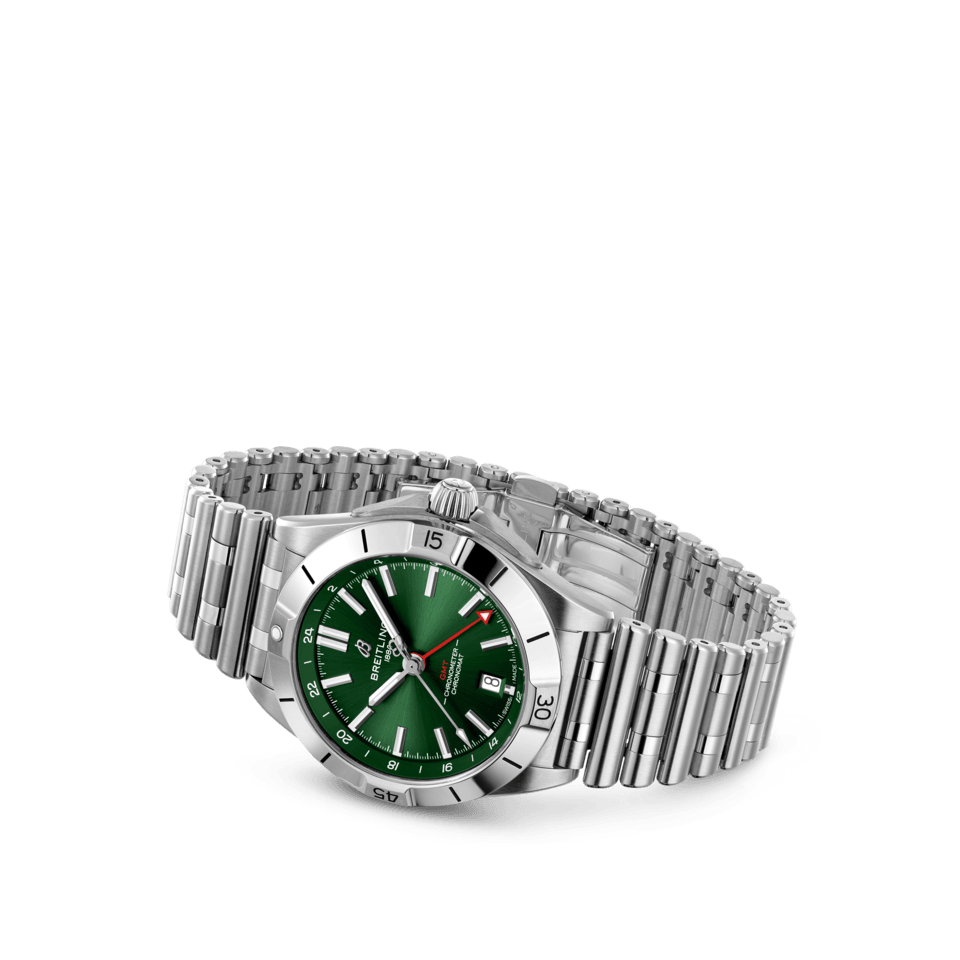 The Chronomat Automatic GMT 40 is Breitling’s tribute to travel, not only for its dual time zone display but also because of its easygoing aesthetics. Subtle dial colours combined with an all-steel case and bracelet, work with any wardrobe. Meanwhile, the tone-on-time 24-hour scale lets the red GMT hand speak for itself.