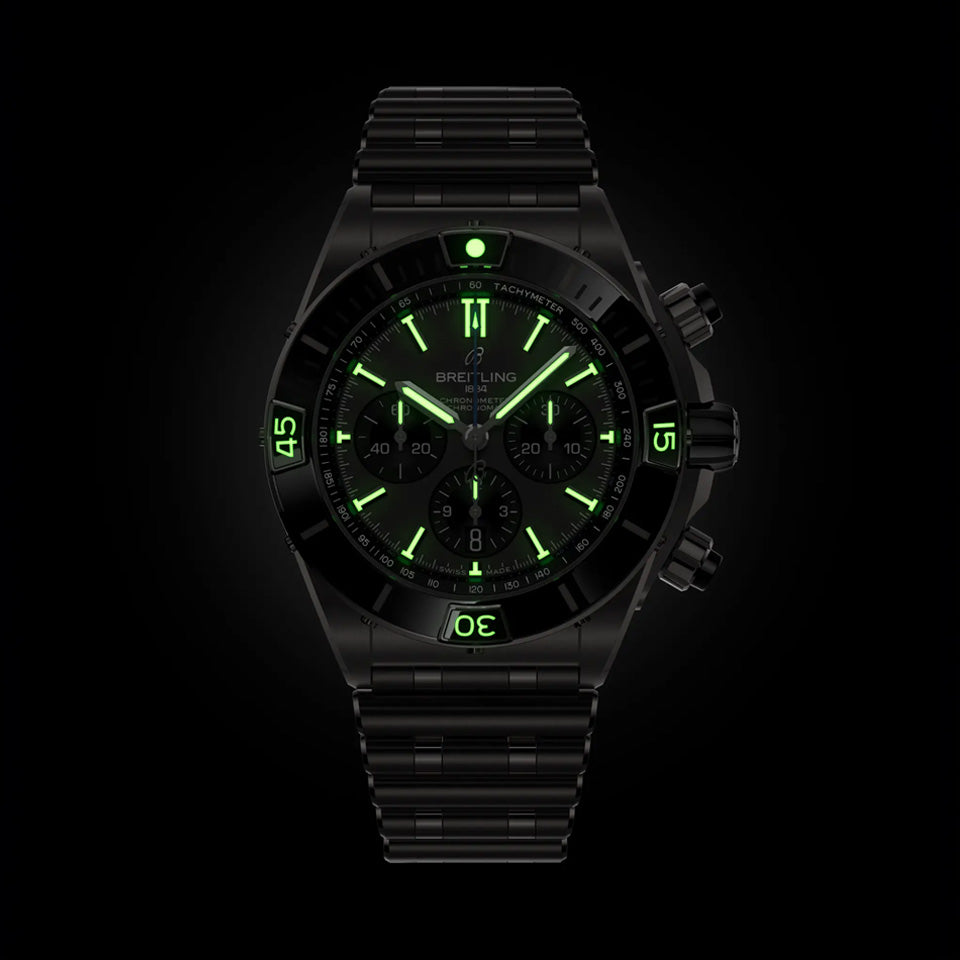 Breitling’s supercharged watch for your every pursuit. The Super Chronomat is inspired by the original 1980s Chronomat that Breitling created for the most daring aerobatic squadrons. The boldest of all Chronomat watches, the Super Chronomat features several ceramic inserts—on the bezel, on the chronograph pushers, and on the crown—as well as a Rouleaux-inspired rubber strap. It’s an all-purpose sports watch that’s just as at ease at the gym as it is at a gala. The Super Chronomat comes in several color and metal variations, from stainless steel to 18 k red gold, and ultra-lightweight titanium. It either features the iconic Rouleaux bracelet or a rubber Rouleaux-inspired strap, matched with a folding clasp. The Super Chronomat B01 44 is powered by the Breitling Manufacture Caliber 01, a COSC-certified chronometer.