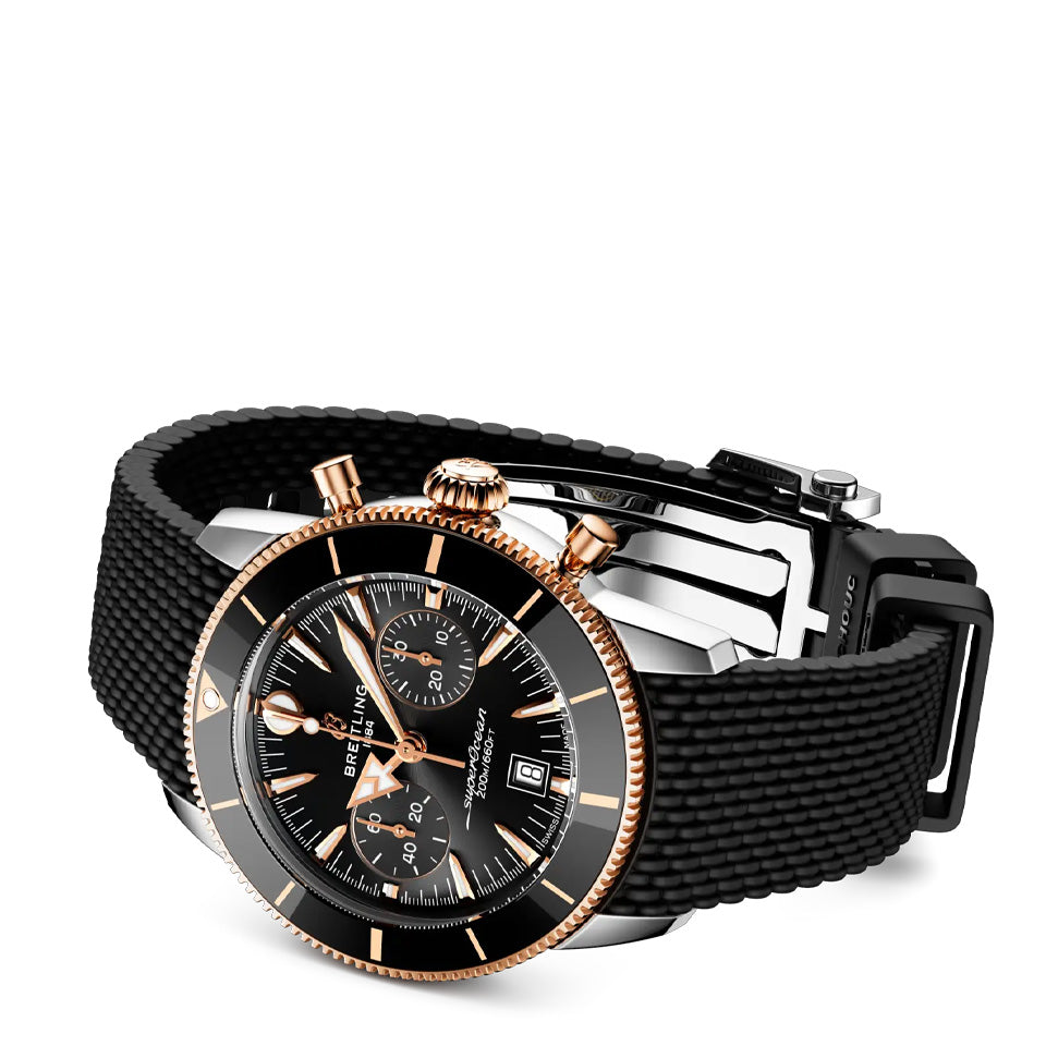 Made to move between the waves and the waterfront. The Superocean Heritage is no ordinary sea watch—it never was. When Breitling first launched it in 1957, it took a different tack from other dive watches of the era. The Ref. 1004 (a sleek time-only piece) and Ref. 807 (the world’s first dedicated dive chronograph) weren’t just about exploring the underwater world—they were about looking good doing it. The spear-and-arrow hands, ceramic rotating bezel, and naturally sleek proportions made it a favorite of stylish adventurers who lived for the sea and the scene. Today, that philosophy is still at the core of the Superocean Heritage. It’s got the soul of the 1950s, but designed for today. The latest Superocean Heritage builds on everything that made the original distinctive—and sharpens it. The chronograph is powered by the Breitling Manufacture Caliber 01, Breitling’s industry-leading timekeeping movement. A ceramic-inlayed bezel adds exceptional scratch resistance, while integrated mesh-metal or mesh-rubber bracelets fit snugly against the case, secured with folding clasps for a clean, watertight finish. Tone-on-tone subdials, a discreet date window at six o’clock, and the original signature hands—arrow for hours, spear for minutes—ensure legibility and balance, above or below the surface.