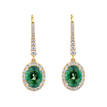 Enquire about Green Tourmaline Oval and Diamond Halo Drop Earrings in 18ct Yellow Gold