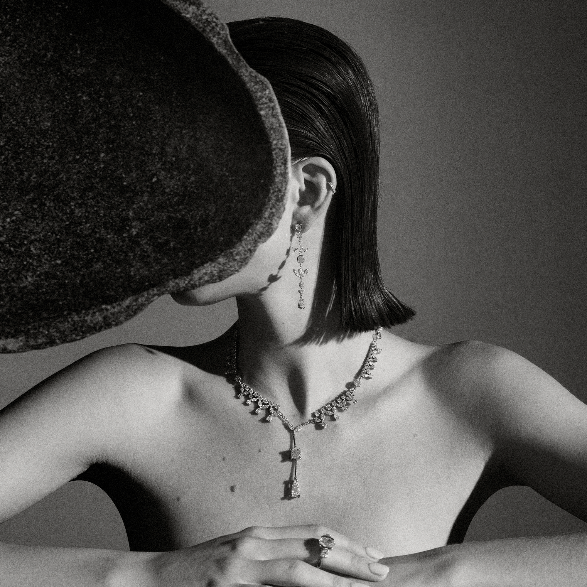 Inspired by the glamour of classic cinema, Hardy Brothers’ Vault Necklace blends art and jewellery craftsmanship. Featuring over 22 carats of hand-selected Yellow and White Diamonds set in white gold, this piece radiates optimism and timeless elegance. A distinctive 2-carat Pear Cut Diamond pendant adds graceful movement and sophisticated allure to this statement necklace.
