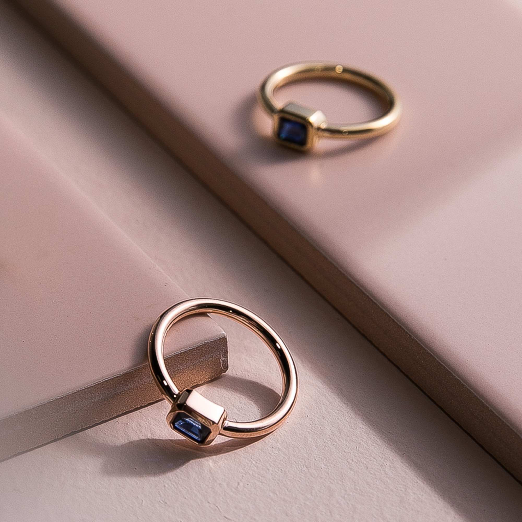 Handcrafted with precision in Australia, the Arabella Sapphire Ring in 18ct Rose Gold highlights an emerald-cut sapphire framed by smooth, fluid lines and a bezel setting, embodying quiet elegance and timeless style.