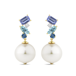 Featuring Tanzanite, Topaz, Sapphire, and Australian South Sea Pearls, these 18ct Yellow Gold Drop Earrings combine vibrant gemstones with expert Brisbane craftsmanship for a unique and artistic look.