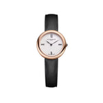 The Joia by Baume & Mercier 10849 is distinctive for its round dial in 4N PVD polished steel, which joins the collection in a 28-mm format. Its crown, set with a black agate, and its solid case back in polished 4N PVD steel complete the understated look. Its silvery sunburst dial showcases Roman numerals and black transfer leaf hands. Powered by a quartz movement (Ronda 751), it offers a 5-year autonomy and is water-resistant to 5 ATM. The black calfskin strap is interchangeable without the use of tools thanks to a very reliable system.
