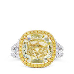 Experience the epitome of brilliance and sophistication with this Vault® ring, a true statement of luxury. At its centre sparkles a remarkable 6.19 carat cushion cut yellow diamond, radiating a vibrant, golden glow that captivates at every angle. Surrounding this extraordinary gem are 1.06 carats of meticulously set white diamonds, adding a layer of dazzling brilliance and enhancing the richness of the central stone.