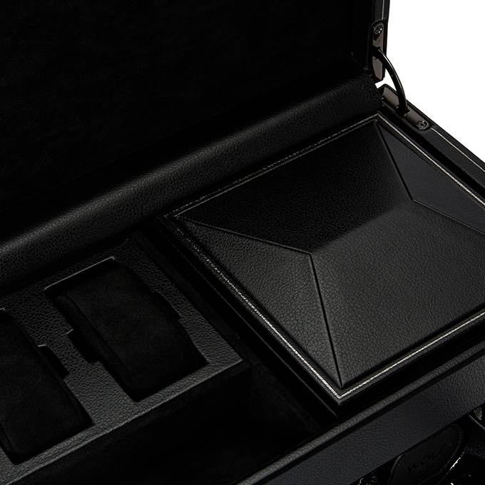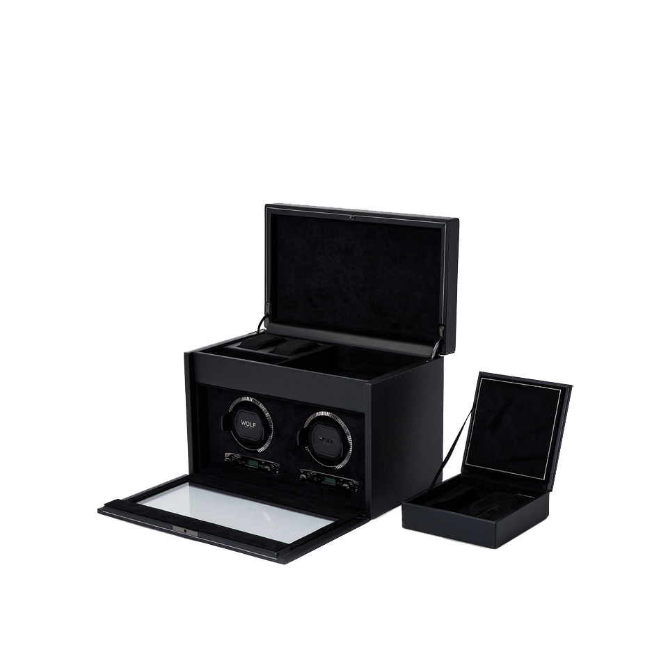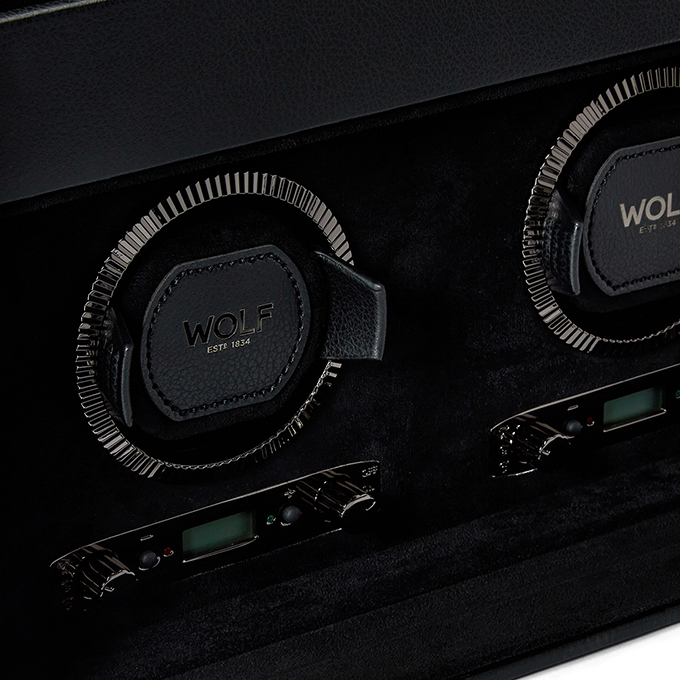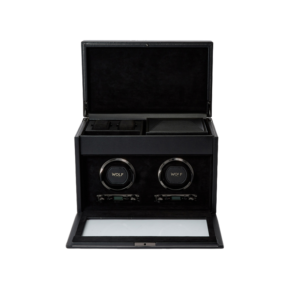 Wolf 1834 British Racing Double Watch Winder with Storage Black Leather Hardy Brothers Jewellers