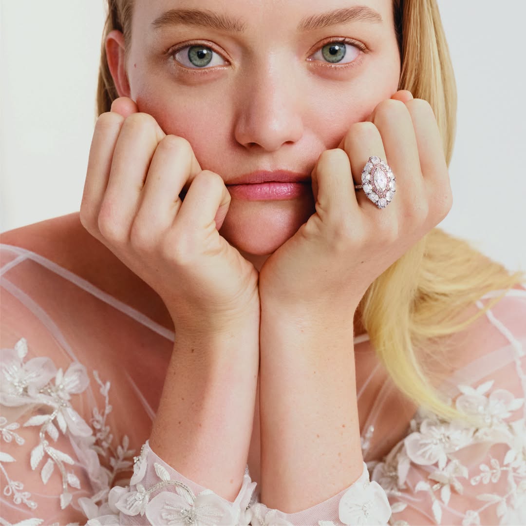 This extraordinary marquise-cut diamond ring exudes timeless French elegance and unparalleled craftsmanship. At its centre sits a stunning 1.54 carat marquise diamond, complemented by a total of 6.95 carats of brilliant white and rare Argyle pink diamonds, including delicately set diamonds that continue around the back of the band—ensuring sparkle from every angle. Crafted in sumptuous 18ct white gold, this piece is a harmonious balance of artistry and luxury.