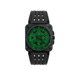 The BR-X3 Night Vision case combines LUM-CAMO – a high-tech composite material merging carbon fiber with luminescent resin – with black PVD-coated titanium and photoluminescent green rubber cylinders, delivering exceptional durability and outstanding legibility, even in total darkness. Its skeletonized dial, highlighted by a green X and protected by a tinted sapphire crystal, reveals the automatic movement and draws inspiration from aeronautical head-up displays, ensuring instant readability day or night.