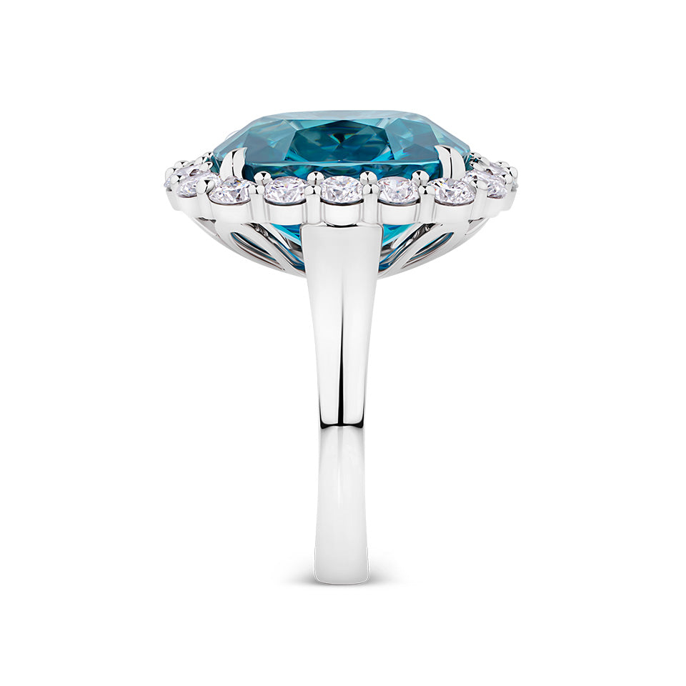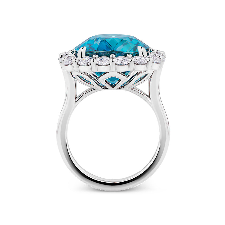 Brilliant and intensely luminous, this Vault® halo ring centres a remarkable 21.91 ct cushion-cut blue zircon, its vivid azure hue enhanced by the polished 18ct white gold setting. Surrounding the centre stone, eighteen round brilliant-cut diamonds add a refined sparkle that accentuates the zircon’s natural fire and clarity, creating a harmonious balance of colour and brilliance. Renowned for its unique properties, zircon allows scientists to track the passage of geological time, a property that has helped date the Earth itself to approximately 4.5 billion years. This ring combines that extraordinary scientific legacy with meticulous craftsmanship, making it a statement piece for collectors who value both rare gemstones and timeless elegance.